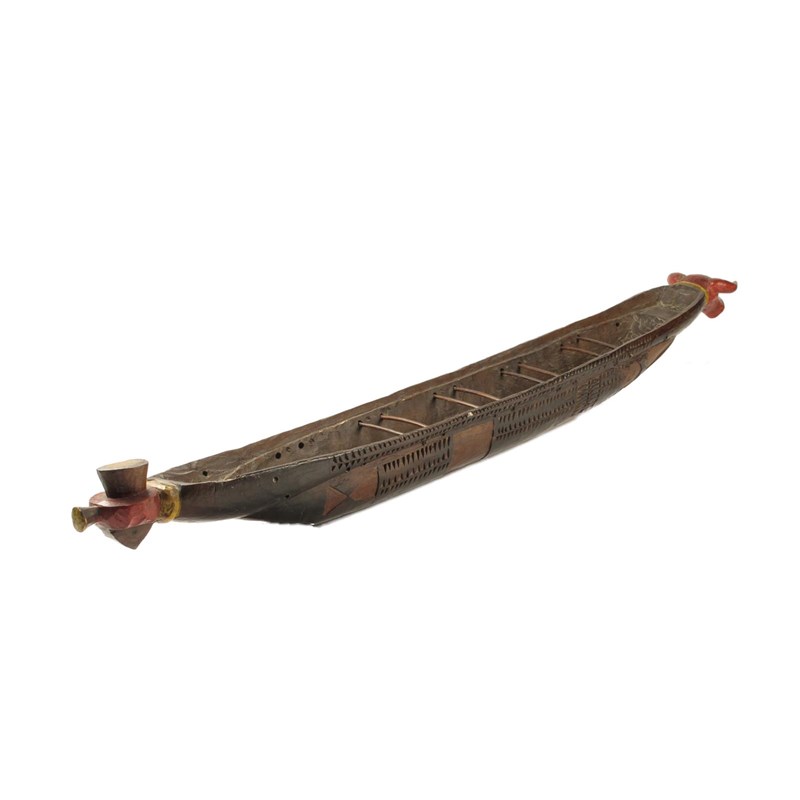 A model canoe, with polychrome decorated bull head prow, the sides with geometric carving including a shark, on later supports, 51in (129.5cm) long.