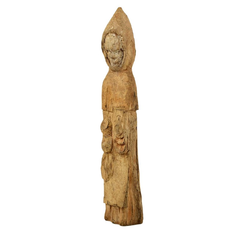 A inuit carved wood Shaman figure, wearing a hooded cloak and holding bags, 14¼in (36cm) high.