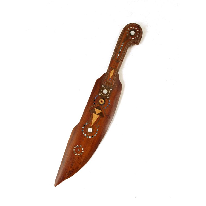 A North American ceremonial wood knife, with a notched carved handle and inlaid beads, mother of pearl and specimen woods, 9½in (24cm) long.