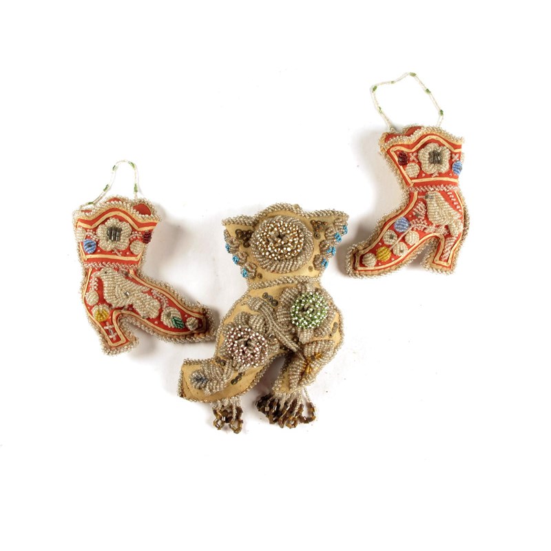 A pair of North American glass beadwork hanging wall pockets, modelled as a pair of ladies shoes, 7¼in (18.4cm) high and another similar larger example, 9in (23cm) high. (3)