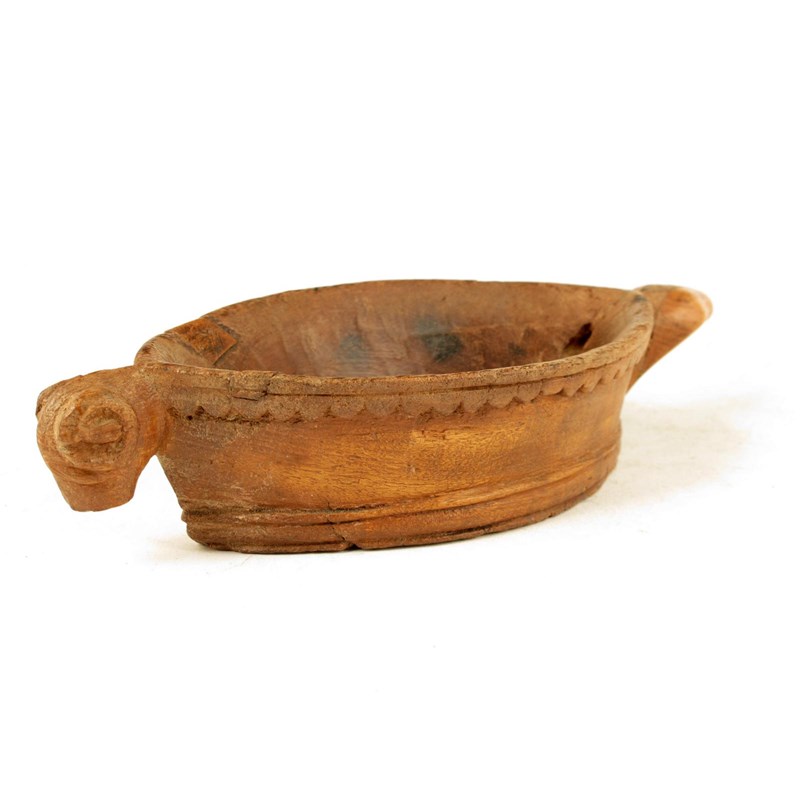 A North West Coast carved wood drinking bowl, of eliptical form, with a bull head handle, scalloped edge and spout, 9½in (24cm) long.