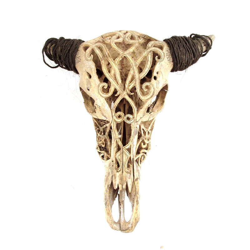 A Dayak ox skull, with carved scroll decoration and horns, 23in (58.5cm) wide.