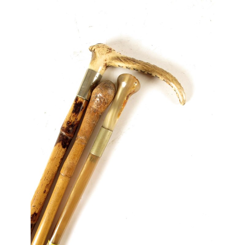 A segmented horn and brass mounted swagger stick, inscribed 'GWADA 1958 FIROZ NOON', 25in (63.3cm) long and two bamboo and leather riding crops. (3)