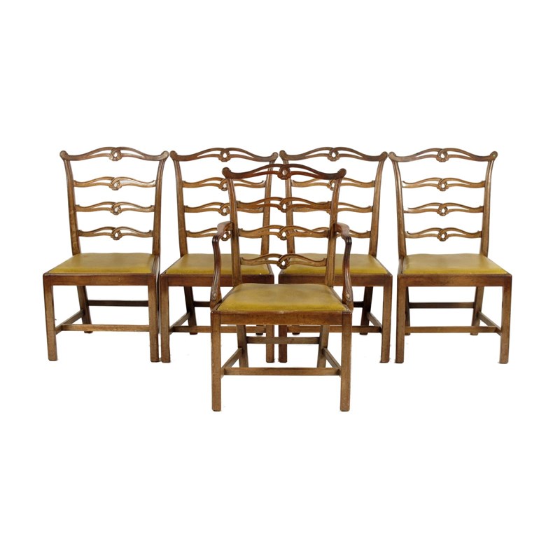 A set of five mahogany dining chairs in George III style, each with a pierced and carved ladder back to a rexine drop-in seat, comprising an open armchair and four side chairs, 19th century. (5)