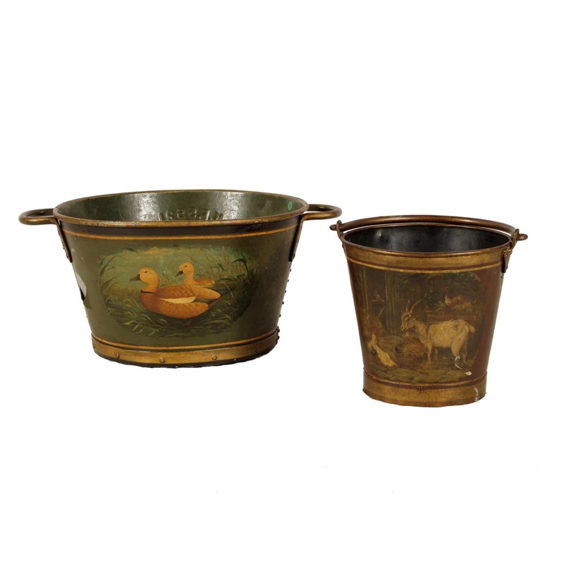 A painted coal bucket, decorated a farmyard scene, with a swing handle, 12¼in (31cm) high and a painted tin log bin, decorated nesting ducks, stamped 'K.F.5521, N.G. LTD, 1955', 25¾in (65.5cm) wide. (2)