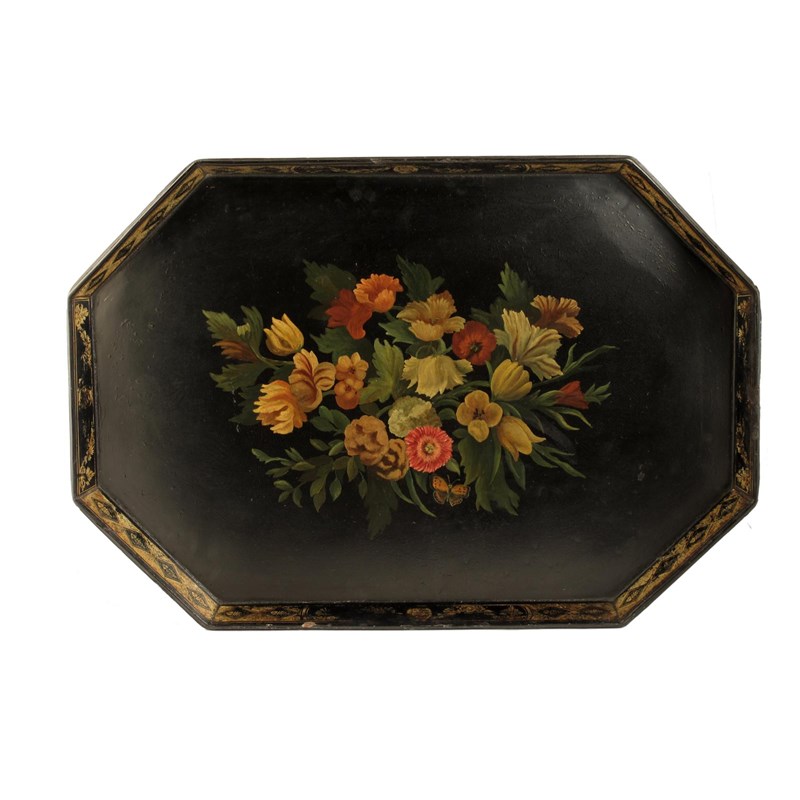 An early Victorian papier-mâché galleried tray, the rim decorated in gilt to a painted centre of flowers and a butterfly, 21 x 30.5in (53.4 x 77.4cm).