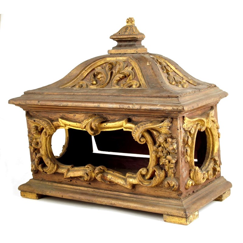 A 19th century continental carved wood and parcel gilt casket, with front and side apertures the reverse with a hinged door, 16in (40.6cm) high, 17¾in (45cm) wide, 8¼in (21cm) deep.