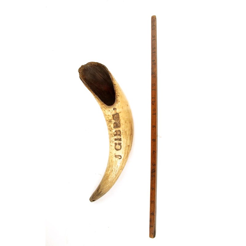 A 19th century treen boot measuring stick, with numbered measurements up to 17, 18in (45.7cm) long and a horn carved with the name 'J. GIBBS', 12in (30.5cm) long. (2)