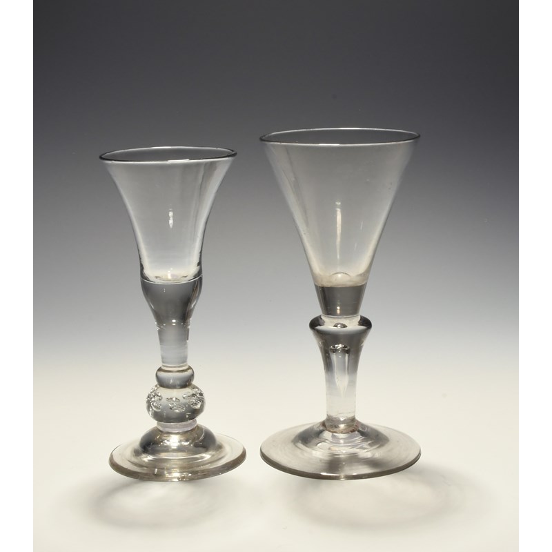one with a bell bowl over a balustroid stem with flattened knops flanking a teared knop over a domed foot, the other with drawn bowl rising from a baluster stem enclosing a long tear (2)