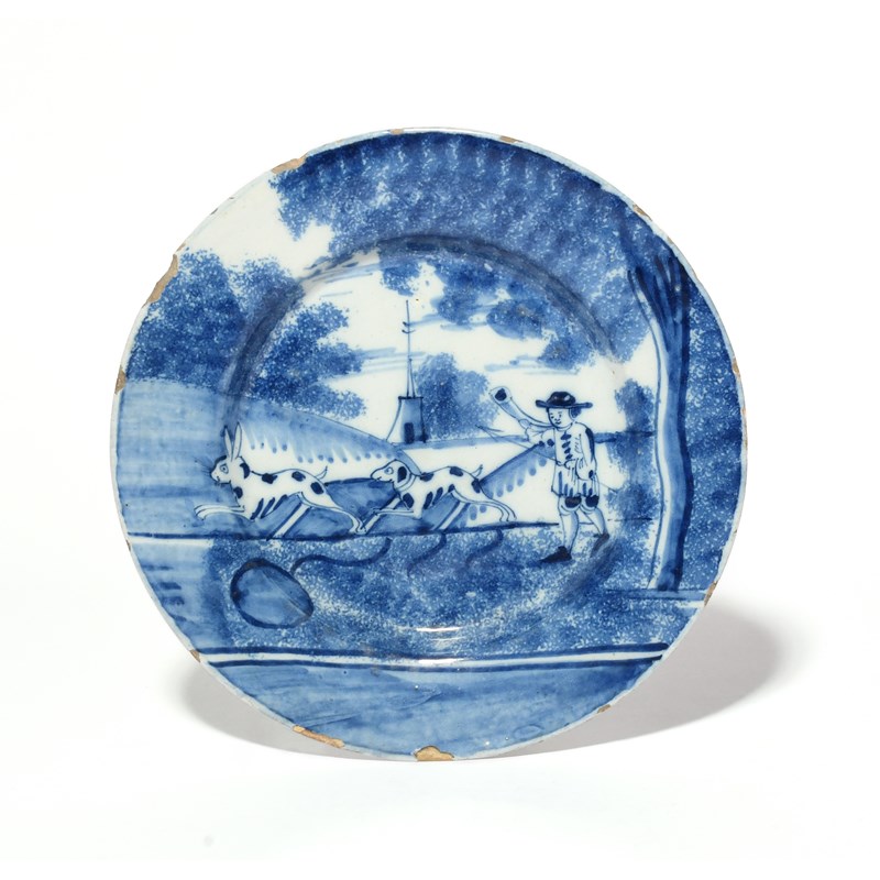 painted in blue with a hare being pursued by a dog, a huntsman walking behind with a horn, a church spire in the distance beneath sponged trees, some rim losses
