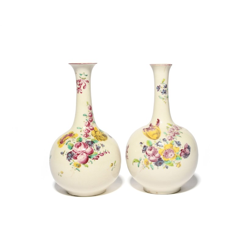 the globular bodies painted with bold flower sprays in a palette predominating in pink and yellow, the reverses with single flower sprays, the tall necks rising to everted rims, minor faults (2)