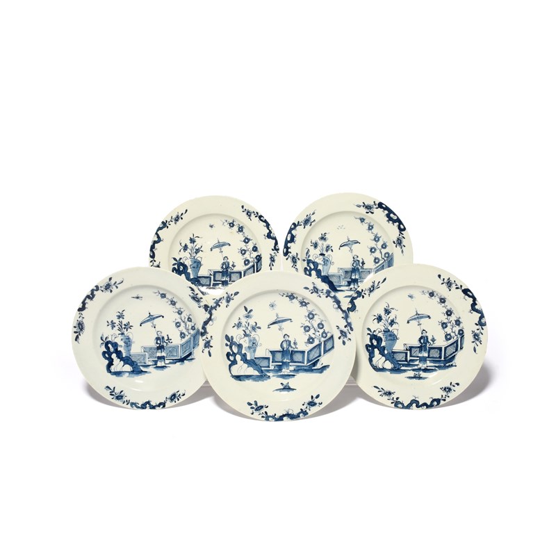 each painted with a Chinese figure holding an elaborate open parasol, standing before a zigzag fence, flanked by a tall vase and flowering plants, the rim with three vignettes of prunus issuing from rockwork (5)