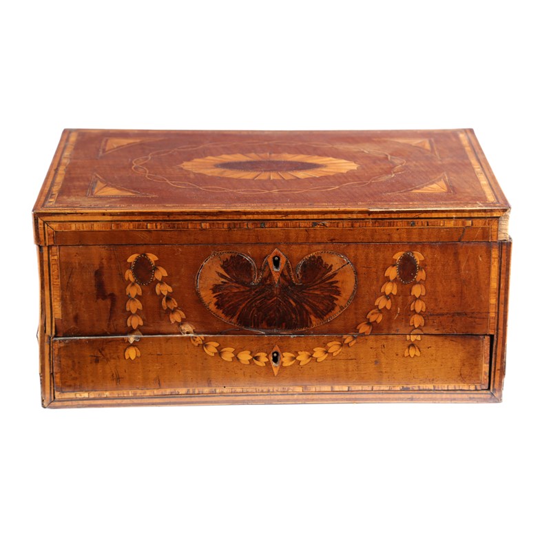 A GEORGE III HAREWOOD AND MARQUETRY WRITING BOX