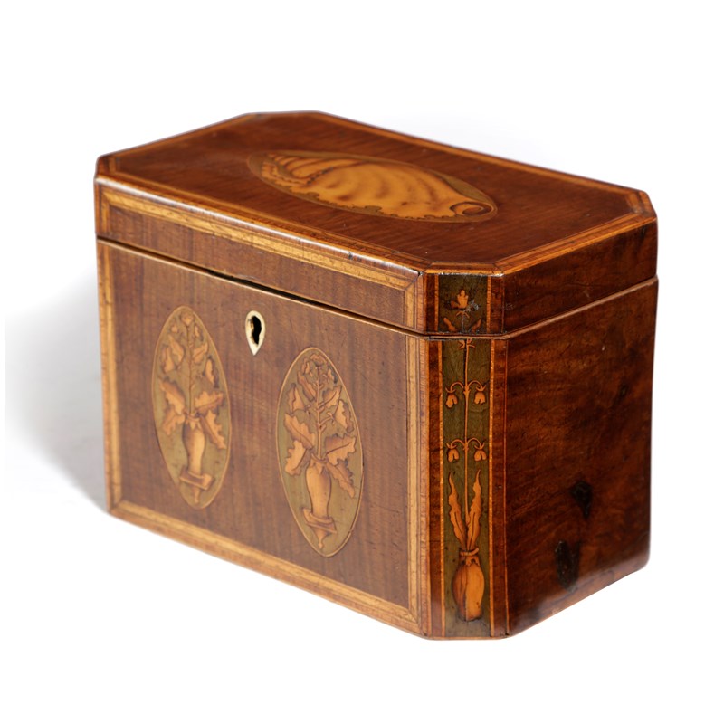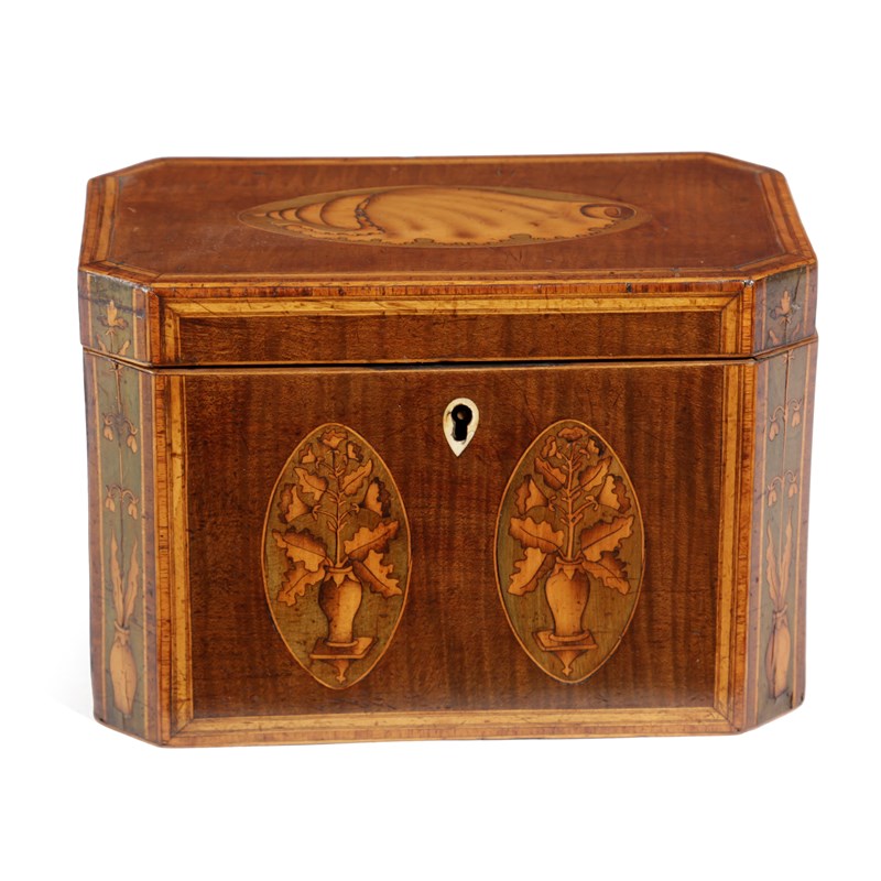 A GEORGE III HAREWOOD AND MARQUETRY TEA CADDY