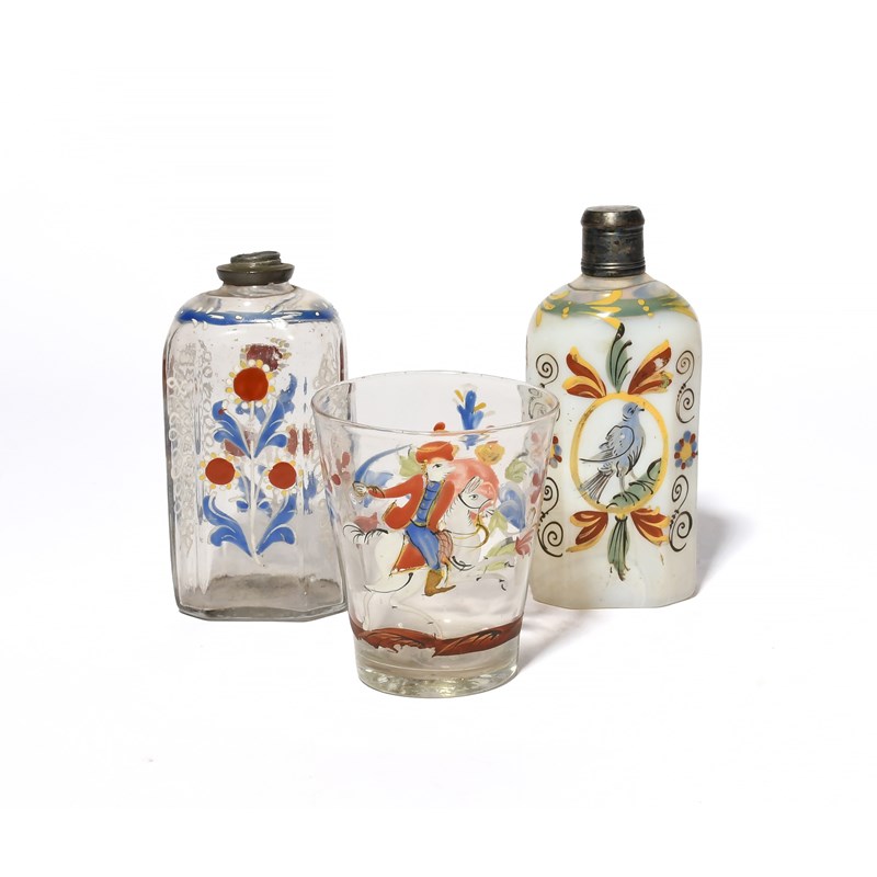 the beaker enamelled with a figure on horseback, the flasks with stylised flower sprays and a bird (3)