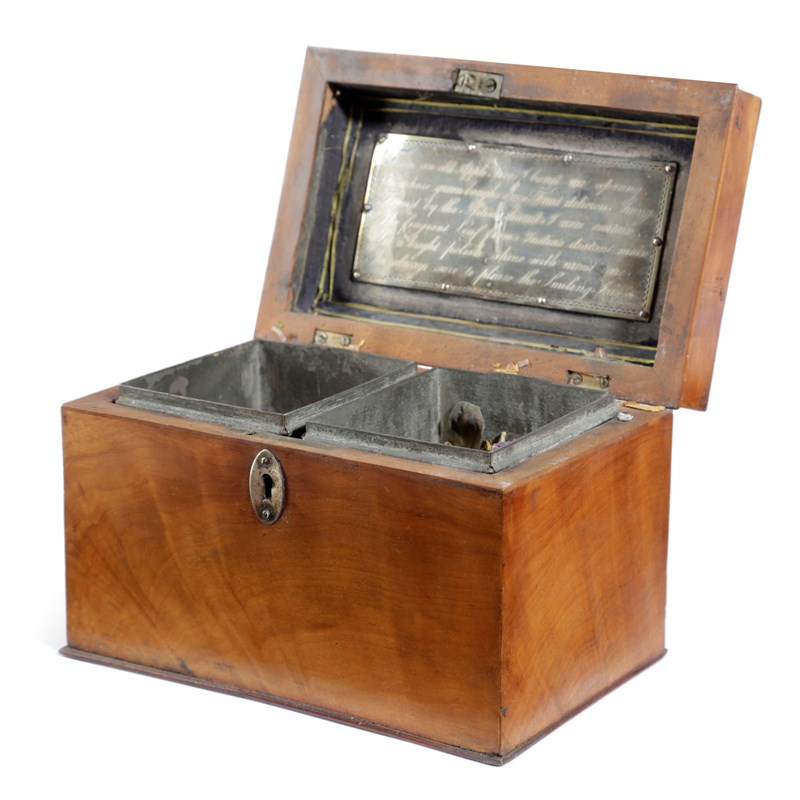 with a pagoda hinged lid the underside with an engraved silver plaque 'From an old Apple Tree I boast me sprung, On whose boughs once Fruit delicious hung, Form'd by the Artist's hand I now contain, The fragrant Leaf from India's distant main, Let a bright polish shine with nicest care, I'm always sure to please the Smiling Fair', signed 'J. Bernard', with twin lift-out zinc canisters, lids missing