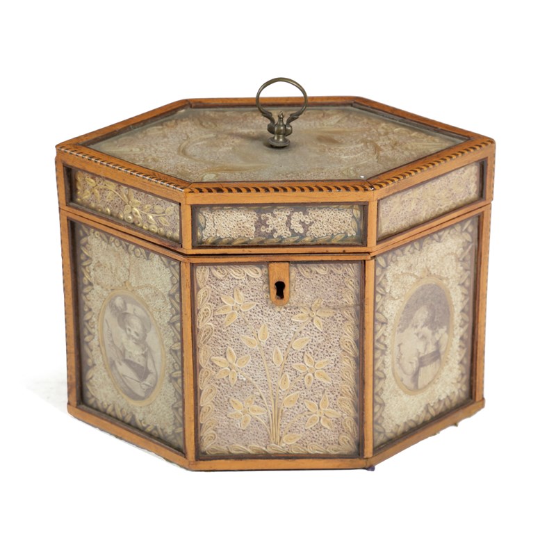 A GEORGE III SATINWOOD AND ROLLED PAPER TEA CADDY