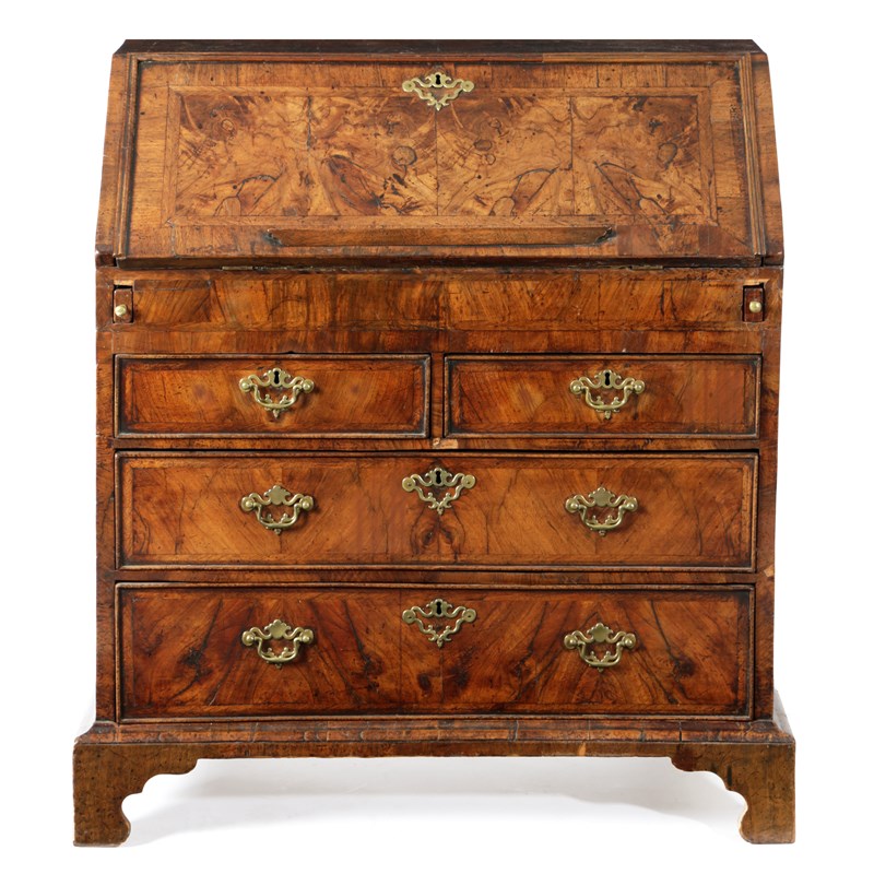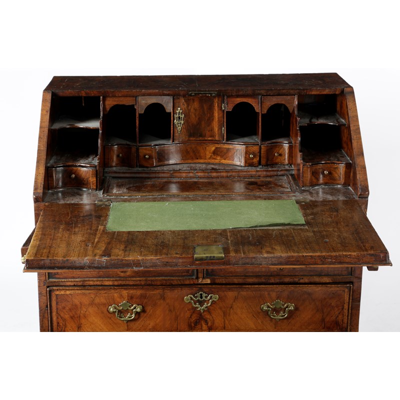 with cross and feather banding, the interior with an arrangement of pigeonholes and drawers above a sliding well cover, above two short and two long drawers