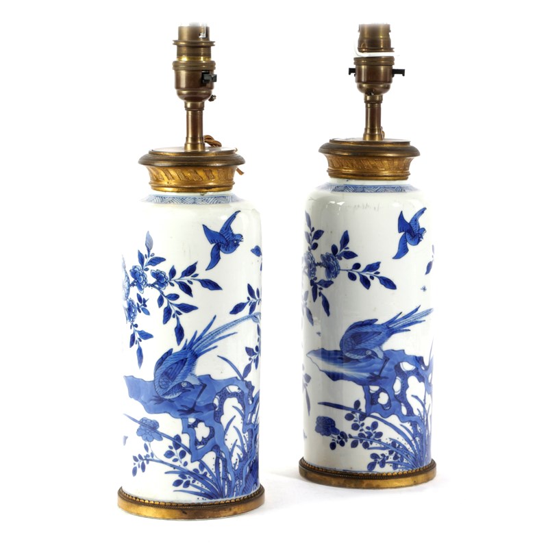 of shouldered cylindrical form, painted with birds amongst flowering foliage, with later gilt metal mounts, fitted for electricity (2)