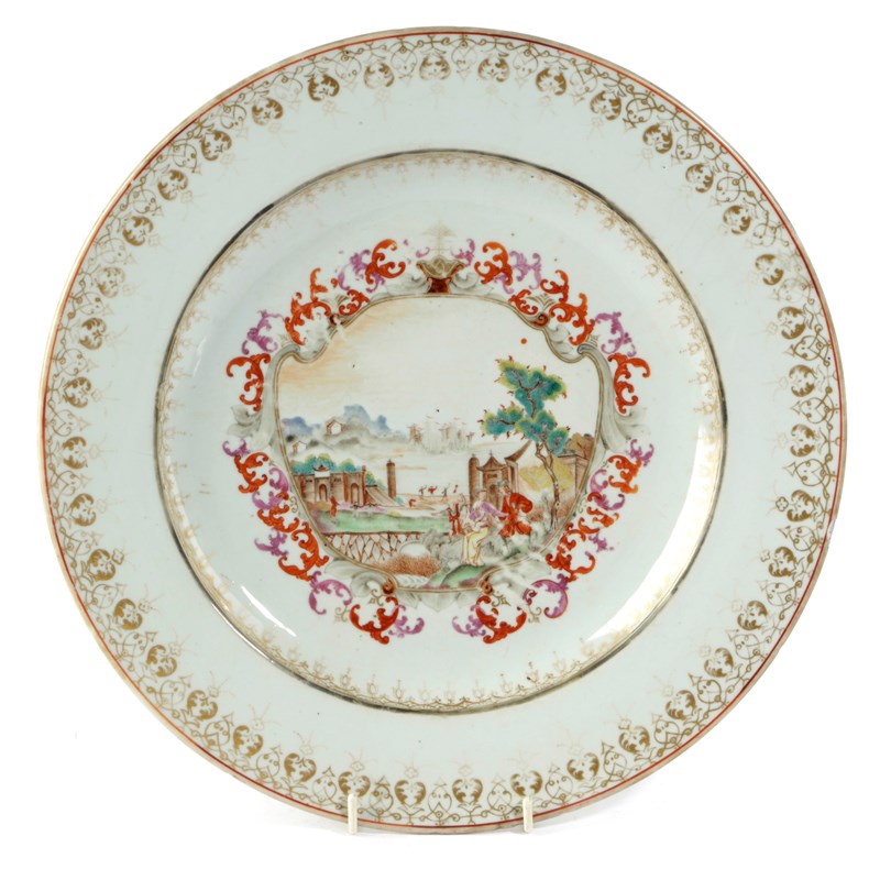 painted in the European style with a couple in a garden with buildings beyond, with gilt borders