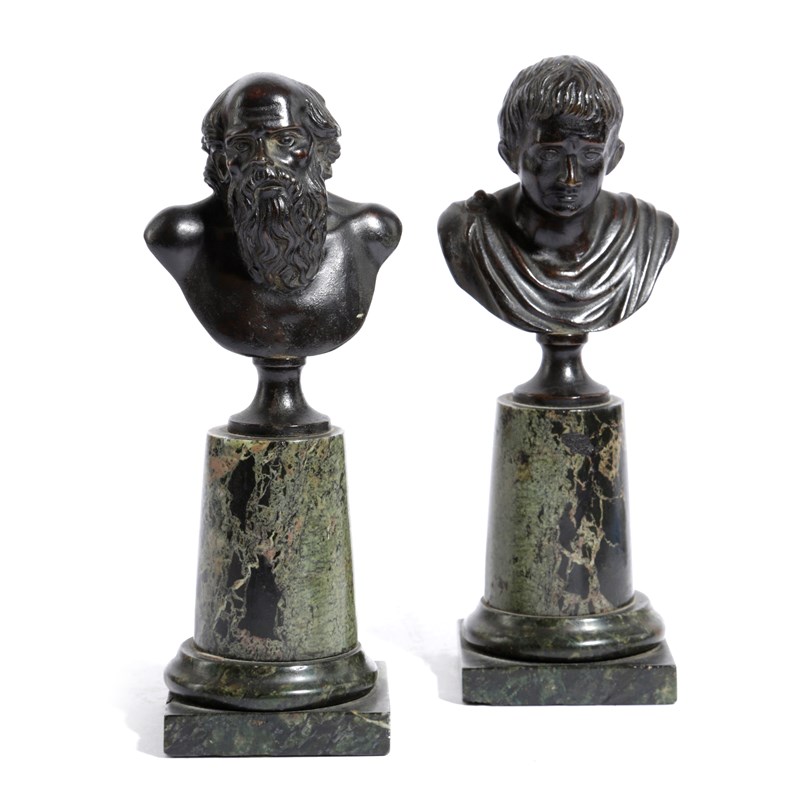 A PAIR OF ITALIAN BRONZE GRAND TOUR BUSTS OF TIBERIUS AND SOCRATES