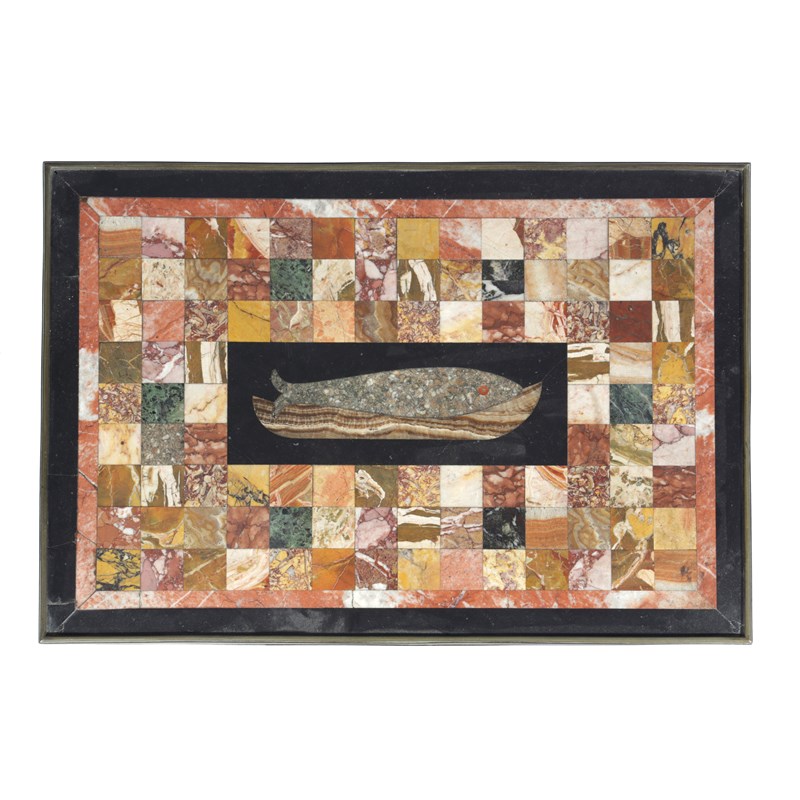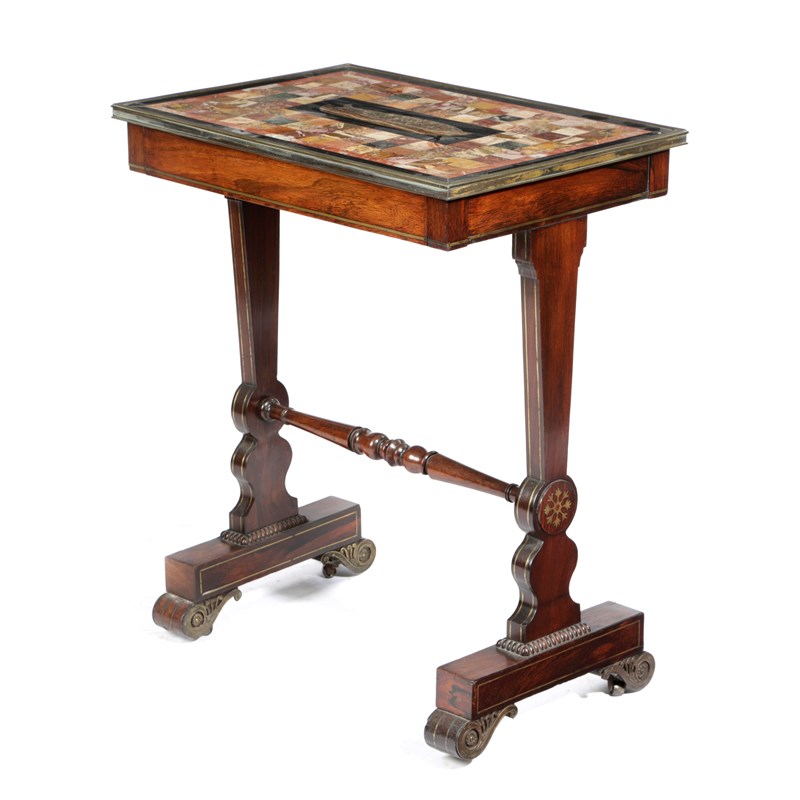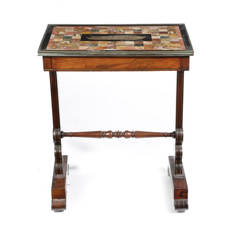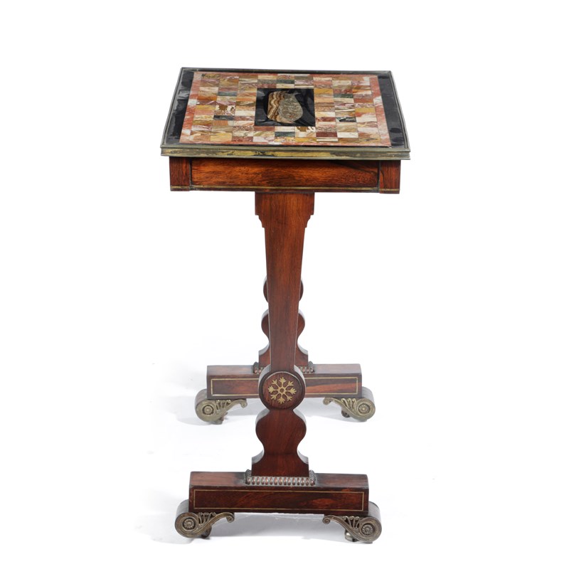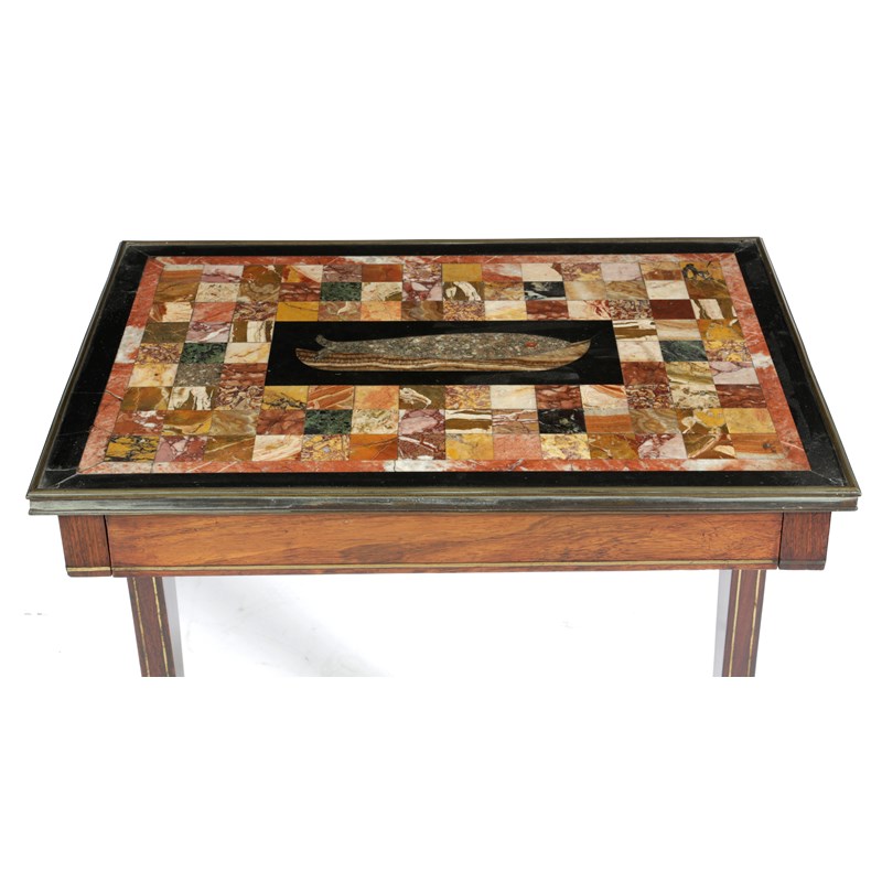the top inlaid with a variety of marbles and alabasters including Siena, rouge griotte and verde antico, the centre with a panel depicting a fish in a bowl, the underside inscribed 'Healey, No 9 Upper Ogle Street, Mary Le Bone, London, 1819', above a frieze drawer on a rosewood and brass inlaid base with scroll feet