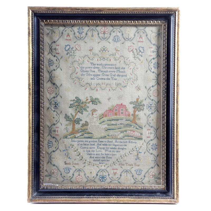 worked with coloured silks on a linen ground with a central scene of a shepherdess seated in a landscape setting beside a tree with her flock before a redbrick farmhouse, with bands of flowers and verses from Isaiah, signed and dated 'Sarah Jones in her tenth year, 1797', in a glazed gilt and ebonised moulded frame
