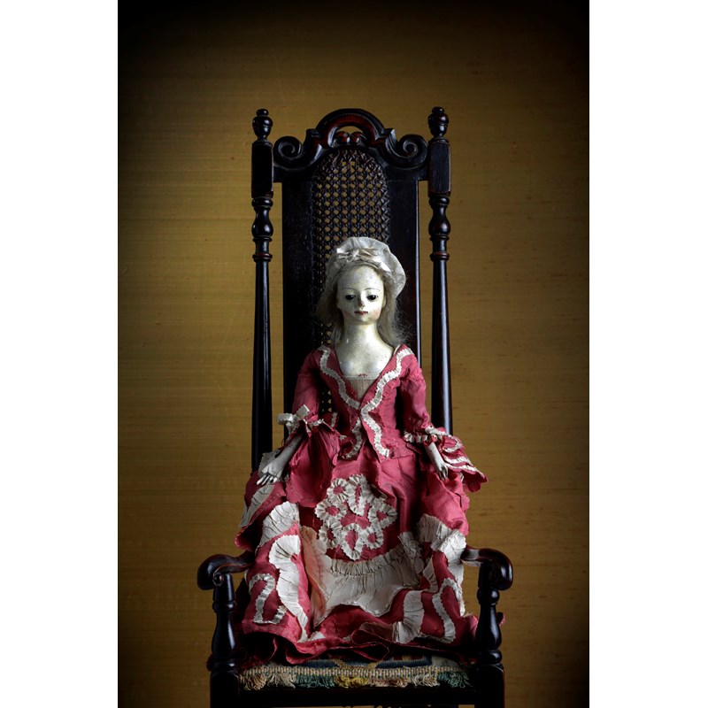 with a carved and painted head and torso, inset black enamel eyes, dotted eye lashes and line eyebrows, with cloth arms and carved and painted wooden hands wearing leather gloves, the doll sporting a bonnet and a pink and ivory silk dress, with articulated legs and with only one silk and leather shoe