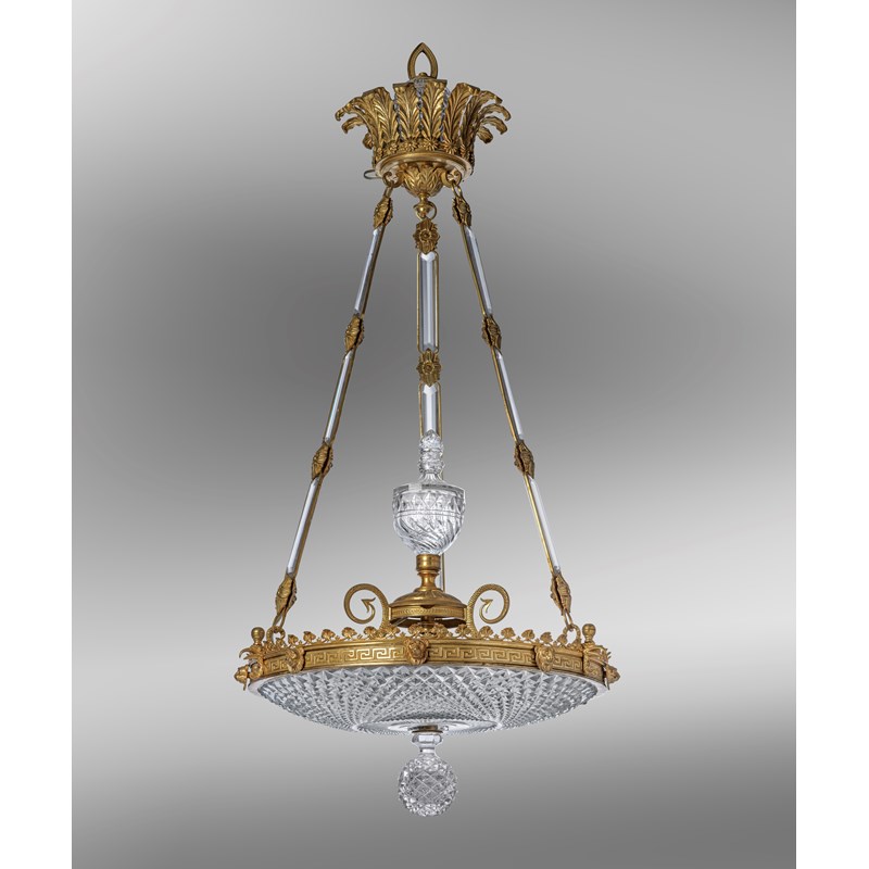 the shade with concentric bands of lozenges in a Greek key and foliate frame supported by three eagle-headed scrolling serpents around a central glass urn and ball finial, suspended from three gilt metal and glass chains and a stiff leaf and flowerhead corona with a glass orb and a ceiling rose