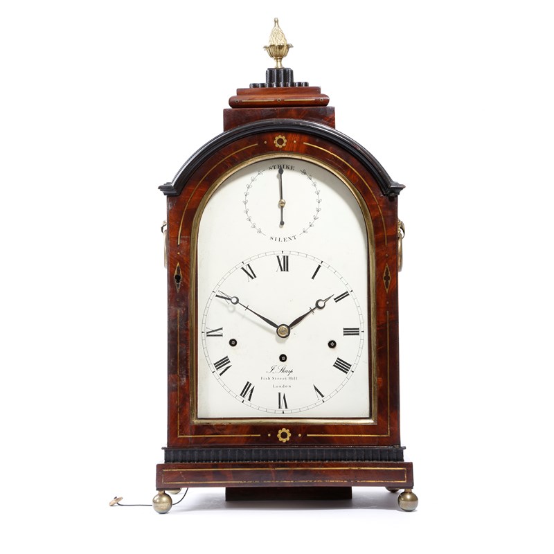 A Regency mahogany chiming bracket clock, the eight day brass three train movement with an anchor escapement and a two inch cylinder striking on eight bells, the re-painted dial with Roman numerals and signed 'J. Sharp Fish Street Hill London', the arched case inlaid with brass with a cone finial, fish scale panel sides and brass carrying handles, on ball feet, 58.9cm high