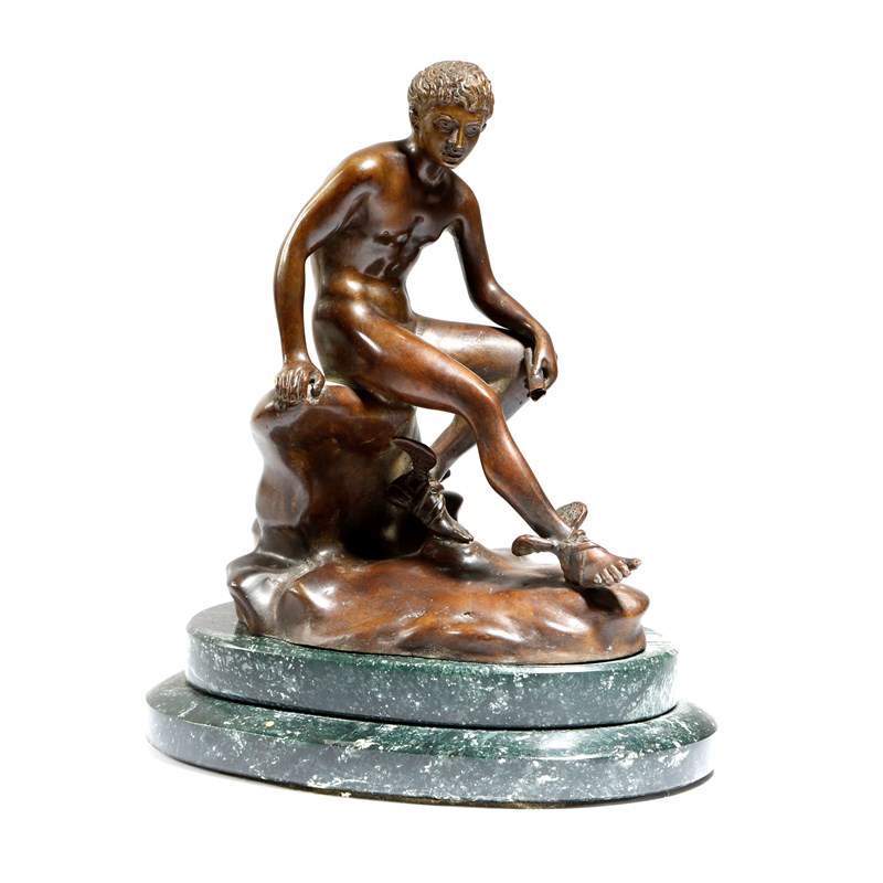 After the antique. An Italian Neapolitan bronze Grand Tour figure of Mercury, seated at rest on a marble rocky outcrop, by the Chiurrazzi foundry, with a pastille and inscribed 'CHIURAZZI NAPOLI LISIPPO', on a stepped green marble base, late 19th / early 20th century, 24.7cm high.