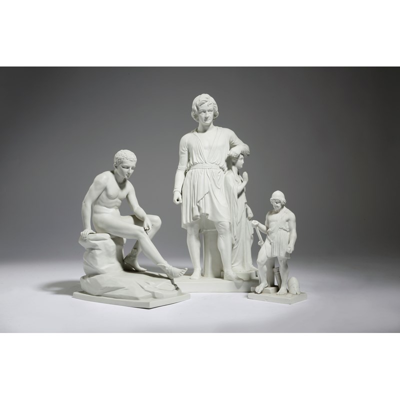 Three 19th century Neo-classical biscuit porcelain figures, two Danish by Copenhagen of Bertel Thorwaldsen with the statue of Hope, the other after Bertel Thorwaldsen of Vulcan, both with impressed marks 'ENERET', together with a Grand Tour figure of Mercury at rest, 34cm high (max). (3)