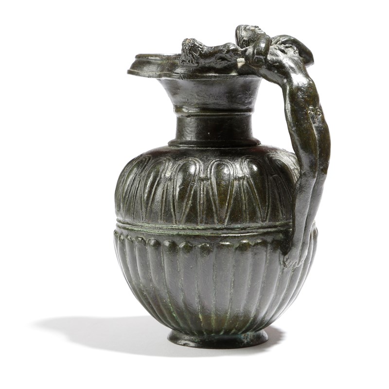 After the antique. A 19th century Italian bronze Grand Tour model of an Etruscan ewer, the handle in the form of a man flanked by a pair of recumbent lions, with a lobed body, 16.3cm high.