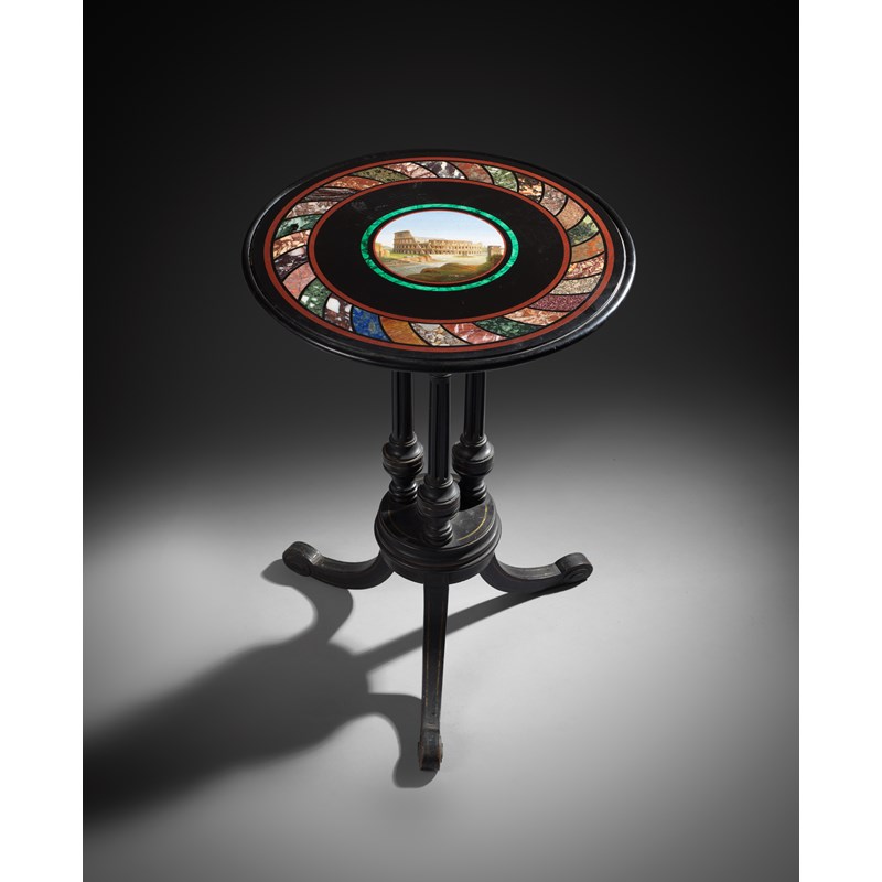 A 19th century Italian Roman micromosaic Grand Tour circular table top, the black marble centred with a micromosaic rondel depicting the Colosseum, within a malachite border and an outer band of specimen hardstones, including: porphyry, lapis lazuli and various marbles, 51cm diameter, on an ebonised wood and parcel gilt base with triple column supports and scroll legs, 73.9cm high (overall).