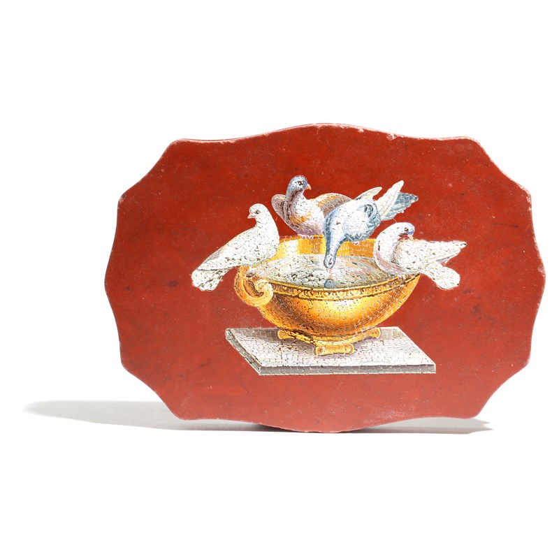 A late 19th century Italian Roman micromosaic Grand Tour paperweight, of serpentine outline, inlaid with the Doves of Pliny, on a rosso antico marble base, 11.6 x 16.5cm.