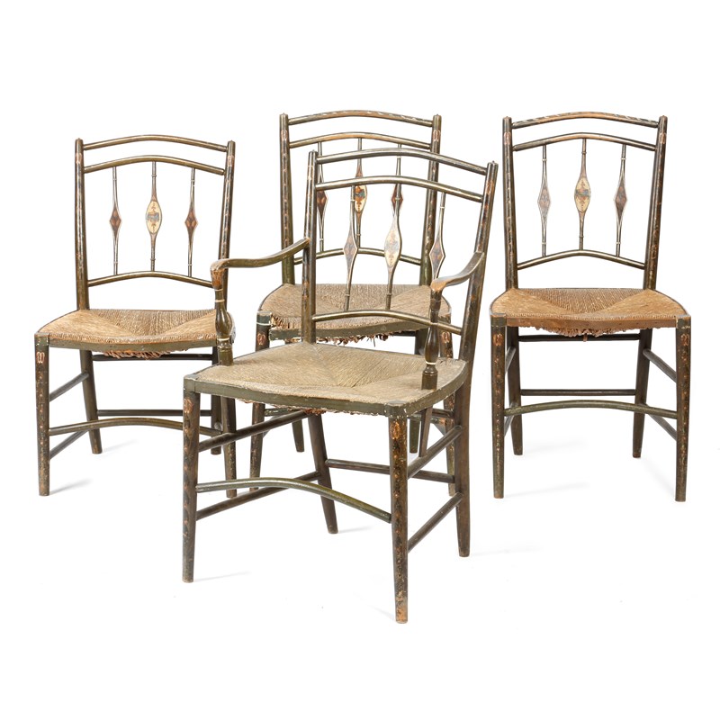 A set of four George III 'Sheraton' painted country chairs, decorated with draped urns and ribbon tied laurel leaves, each with a rush seat, comprising: an open armchair and three side chairs (one reduced). (4)