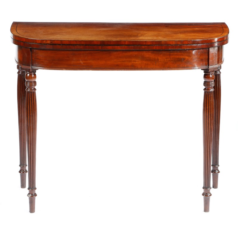 A Regency 'D' shaped tea table, inlaid with ebonised stringing, the hinged fold-over top on twin gate supports, on ring turned and baluster ribbed legs, 74cm high, 91.6cm wide, 45.2cm deep.