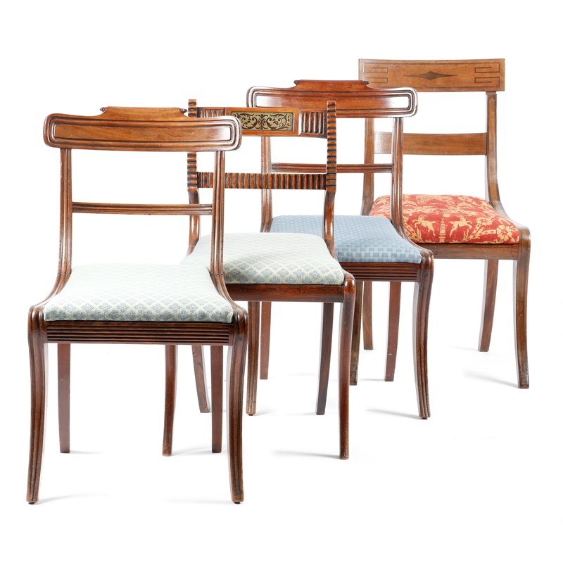 A pair of Regency mahogany side chairs, each with a curved tablet back above a drop-in seat and sabre legs, together with a simulated rosewood side chair with a ribbed back and a brass marquetry panel and a mahogany side chair with ebonised Greek key decoration. (4)