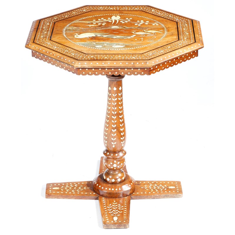 λ An Anglo-Indian hardwood occasional table by Bru Lal Mangat Ram Jain, inlaid with ivory, bone and ebony, the octagonal top with a polychrome decorated landscape scene with two pairs of peacocks, a pair of parrots on a branch and a swan, on a baluster stem and a cruciform base, the underside with printed paper labels, one inscribed 'Dabbi Bazar HOSHIARPUR Punjab India', late 19th / early 20th century, 54.5cm high, 54.8cm wide.