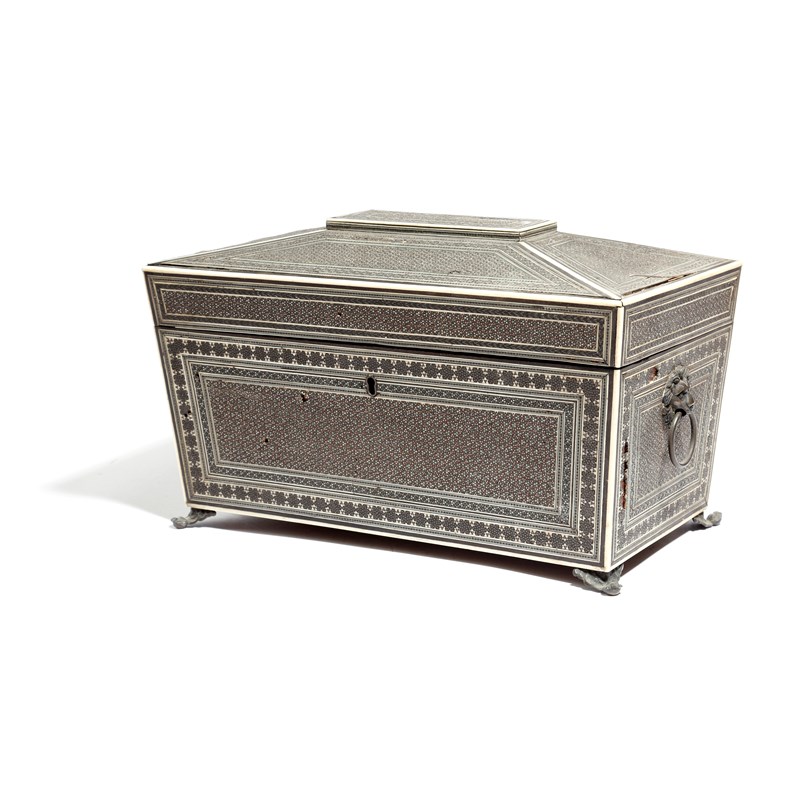 λ An Anglo-Indian sadeli tea chest, of sarcophagus shape, inlaid with ebony and ivory stringing and with bands of panels of parquetry mosaic, the hinged lid decorated to the underside, revealing a pair of rosewood and sadeli tea canisters with hinged lids and with an aperture for a sugar bowl, with lion's mask ring handles and cast iron lion's paw feet, Western India, Bombay, first half 19th century, 18.2cm high, 30.2cm wide, 15.4cm deep.