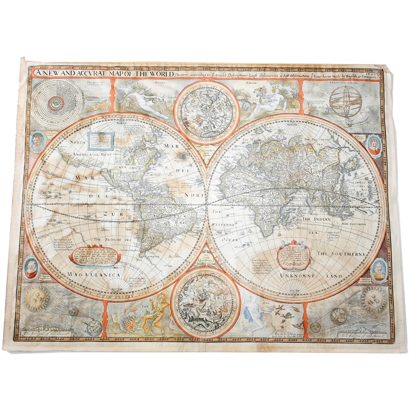 John Speed (1552-1629). 'A NEW AND ACCURAT MAP OF THE WORLD Drawne according to ye truest Descriptions latest Discoveries & best observations ty have beene made by English or Strangers 1626', a hand-coloured twin-hemisphere engraved map, with astrological and astronomical diagrams, with allegorical figures representing the four elements, with portraits of famous explorers, inscribed 'Are to be sold Pops-Head Alle by Geor. Humble', California represented as an island, with English text to verso, 39 x 51cm, unframed.