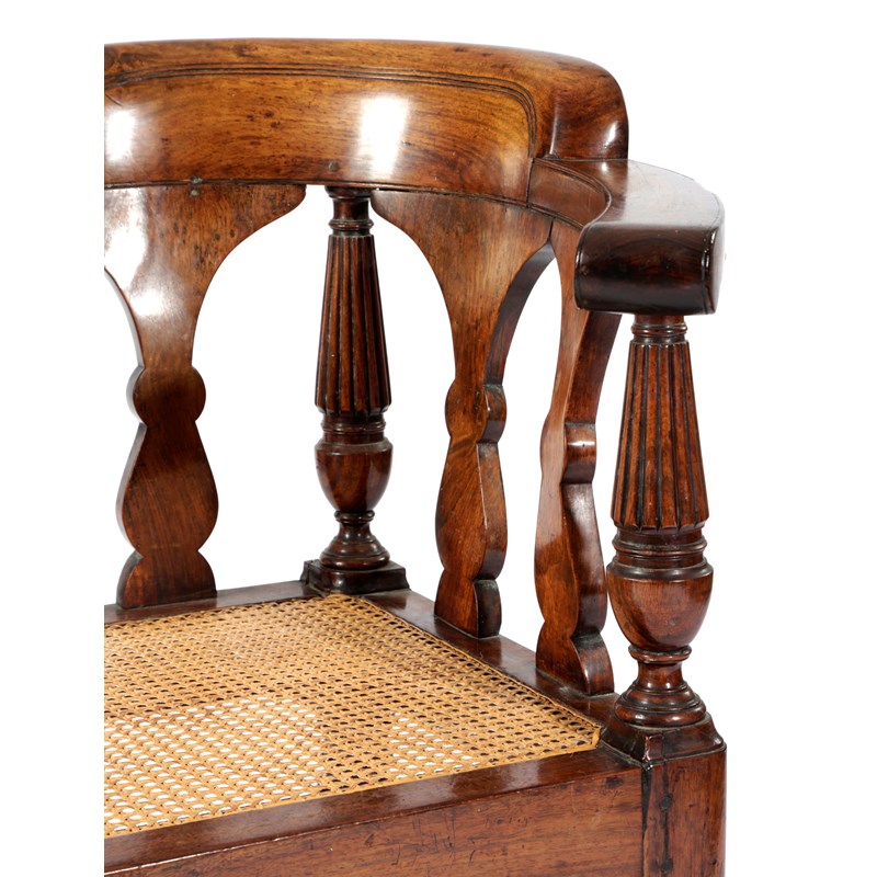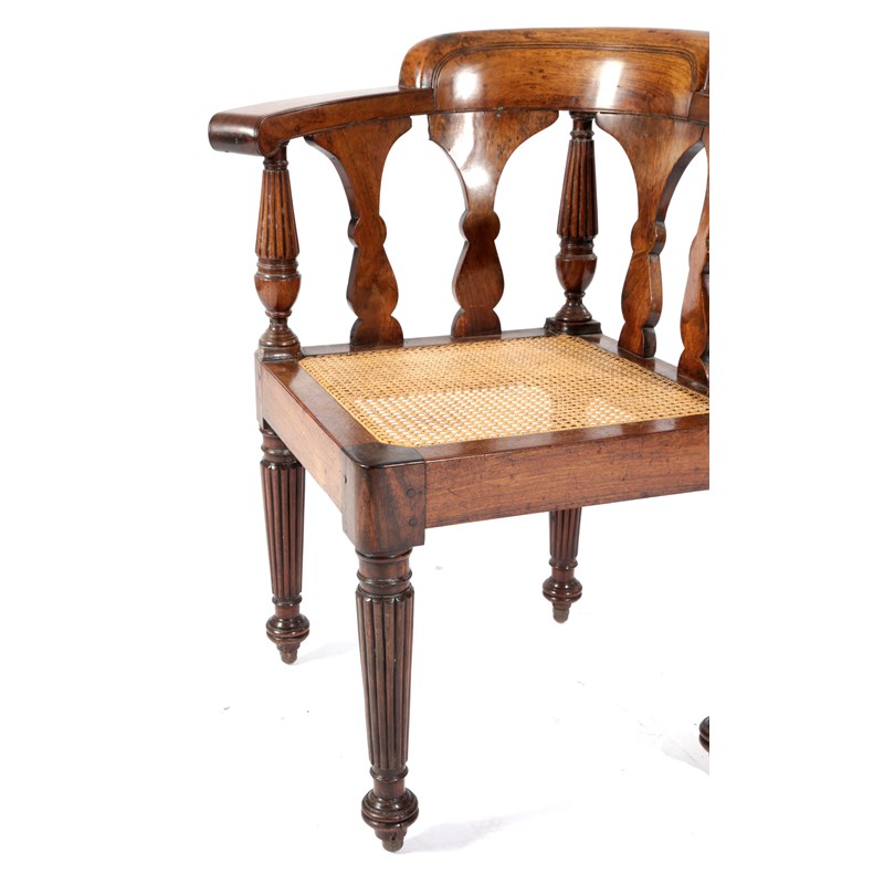 in the manner of Gillows the curved back with vase shaped splats and ribbed and urn supports above a caned seat and ribbed tapering front legs, originally on castors, with a squab cushion