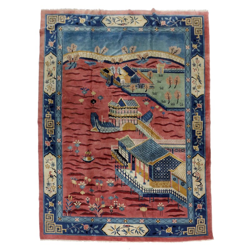 the soft brick red sea with boats and adjacent to a harbour enclosed by indigo borders with ivory angular cartouches containing birds and vines between a sky blue and faded brick guard stripes