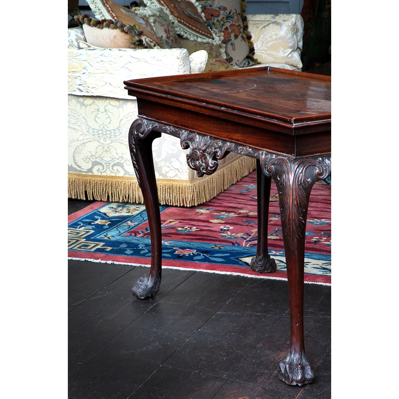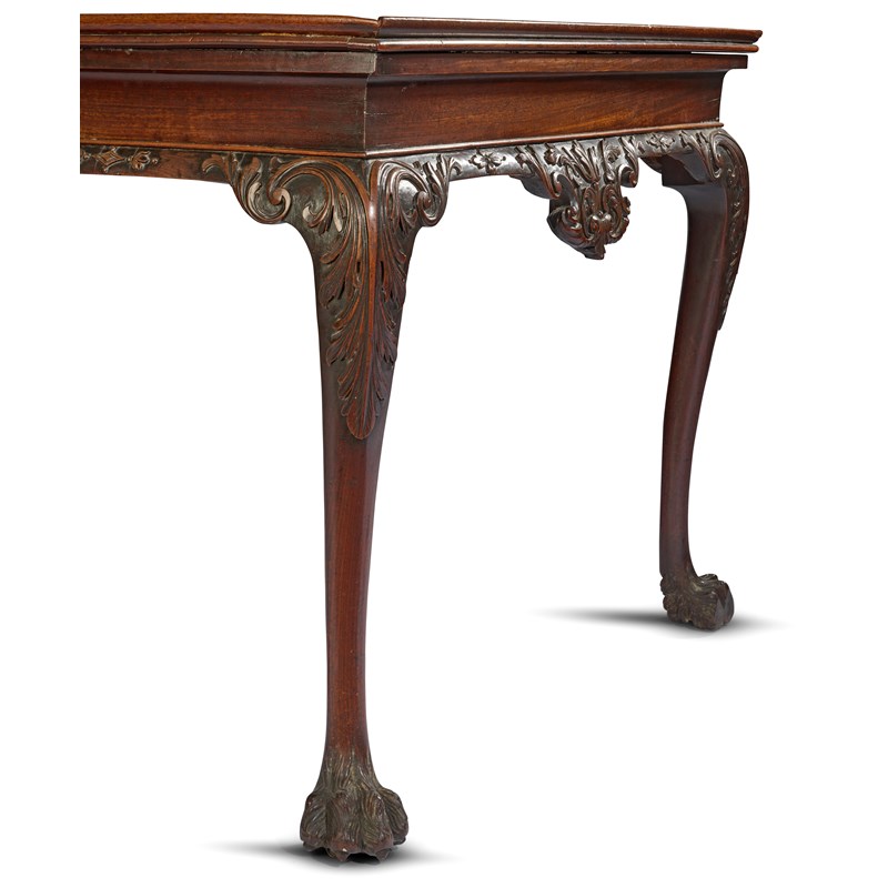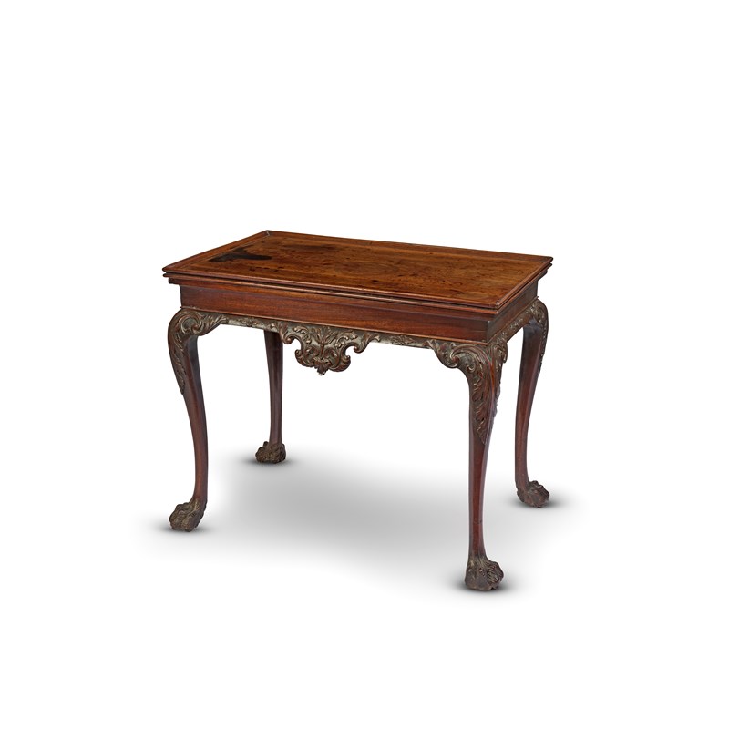 the rectangular top with a moulded gallery above a frieze carved with scrolling leaves, florets and lozenges on acanthus carved cabriole legs, terminating in hairy paw feet and sunken brass roller castors