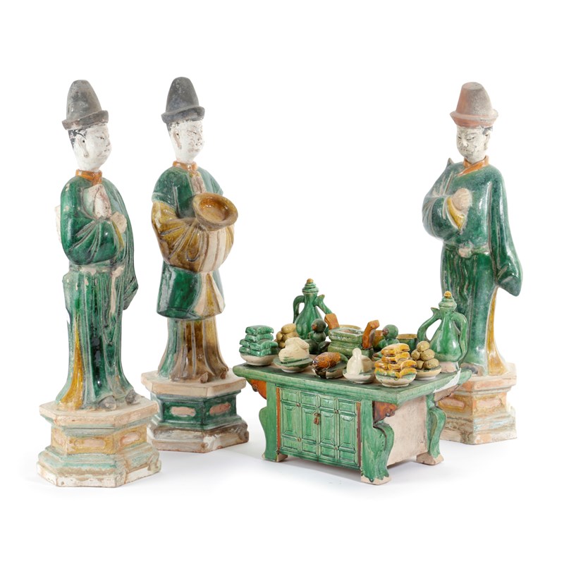 each with a detachable head and wearing green and yellow robes, together with a model of an altar table and fifteen offerings (4)