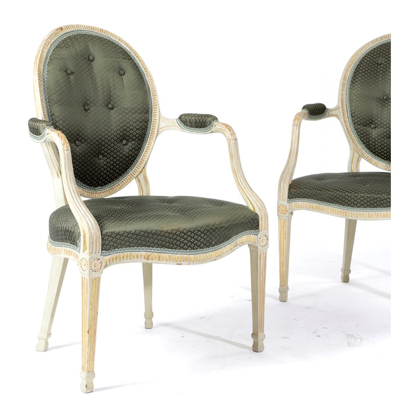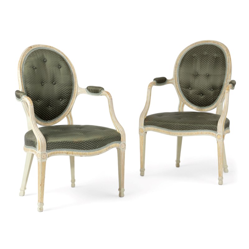 A PAIR OF GEORGE III PAINTED AND PARCEL-GILT ARMCHAIRS