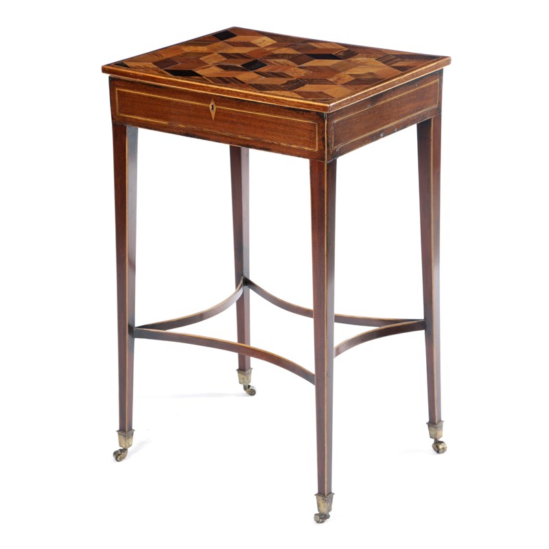 Six work tables with this form of stretcher uniting square tapering legs appear in the Gillows Estimate Sketch Books in the 1790s. The form of parquetry with unusual timbers can be seen in a work box supplied by Robert Gillow IV to Miss Elizabeth Giffard of Neerquis Hall, Flintshire in 1808. For a very similar table see Bonhams Fine English Furniture and Works of Art, 11th March 2009, lot 106.