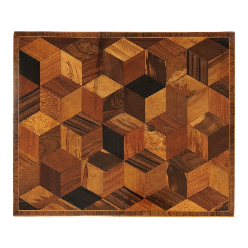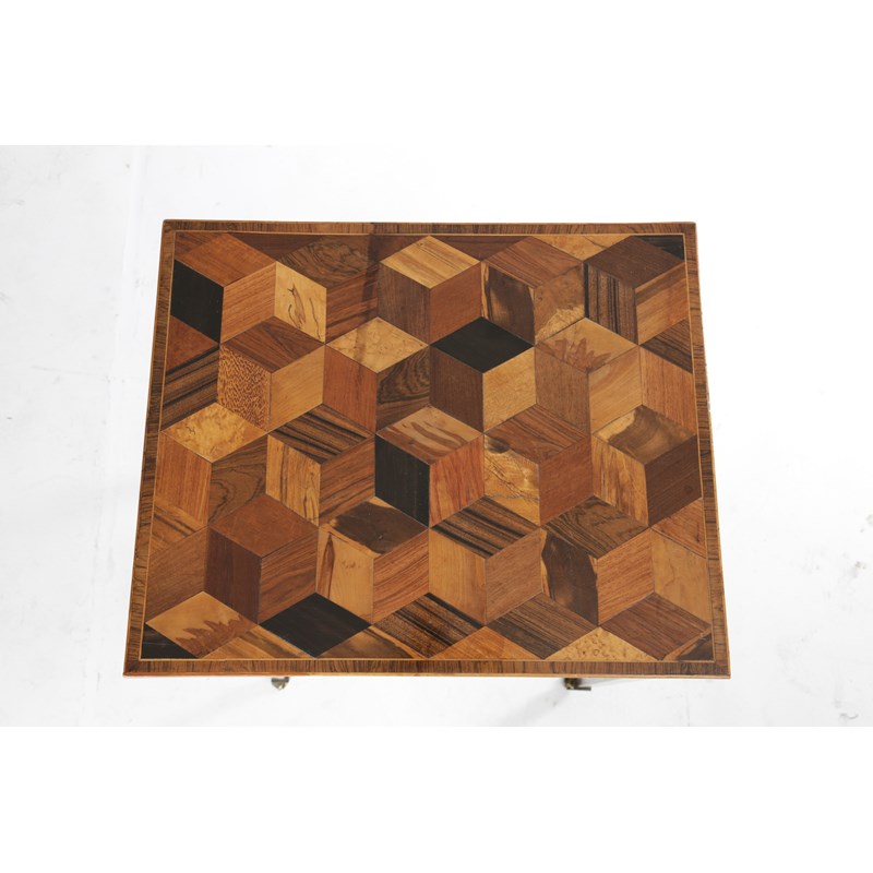 the hinged lid inlaid with cube parquetry with various woods including: palm, calamander, maple and partridgewood, enclosing a fitted interior with coromandel lidded compartments and various utensils, on square tapering legs united by in-curved stretchers, on brass castors