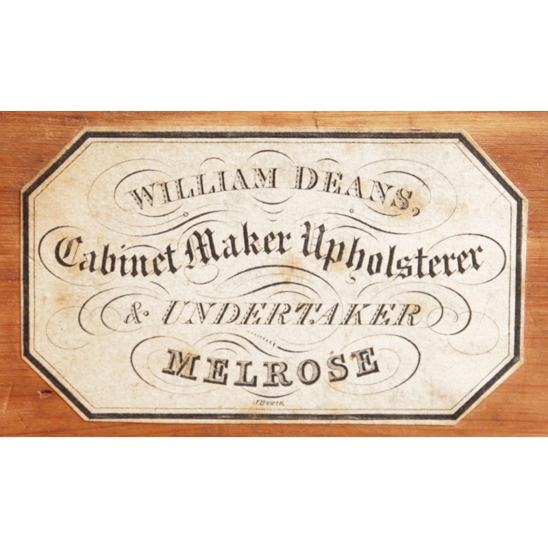William Deans is listed in Pigot & Co.'s National Commercial Directory as having premises in Market Place, Melrose in 1837. William Deans may have served an apprenticeship with James Mein of Kelso, an adjacent town less than 15 miles from Melrose. The quality of the construction and timbers can be compared with the work of Mein and interestingly their trade labels are similar.