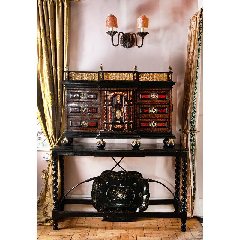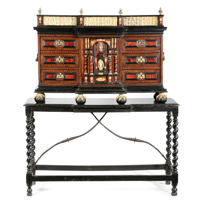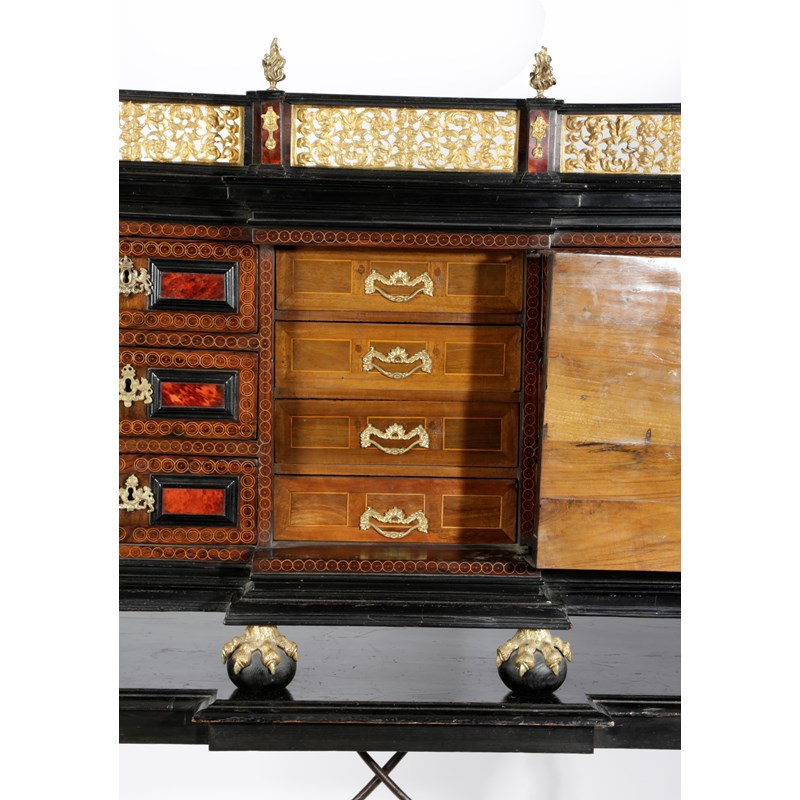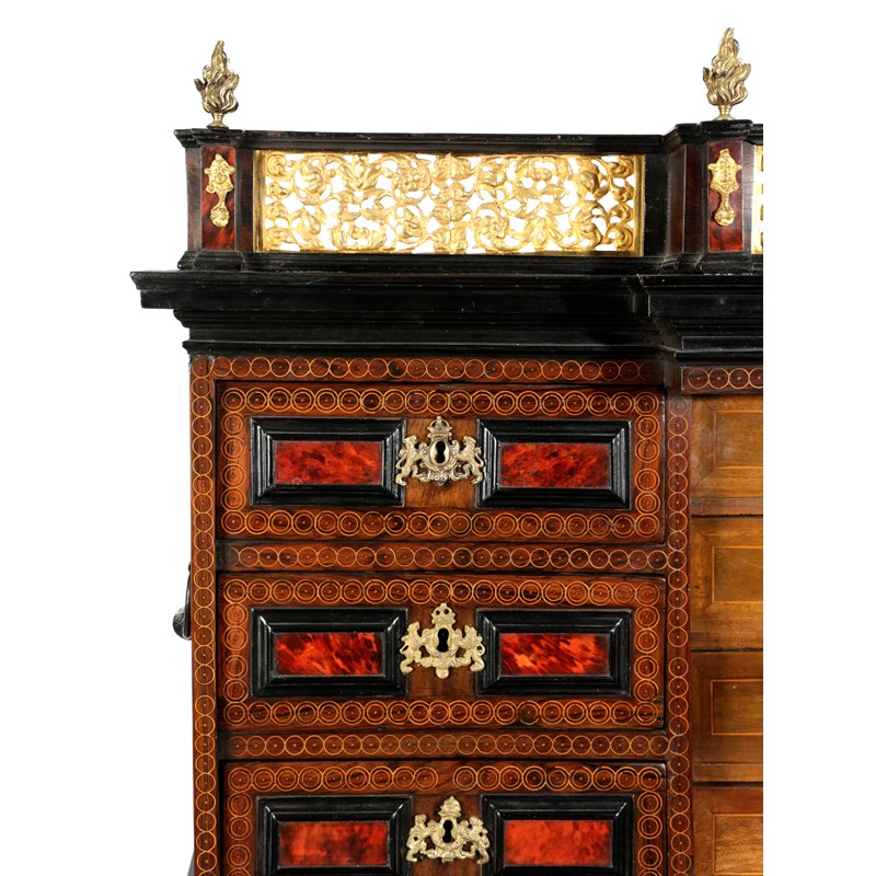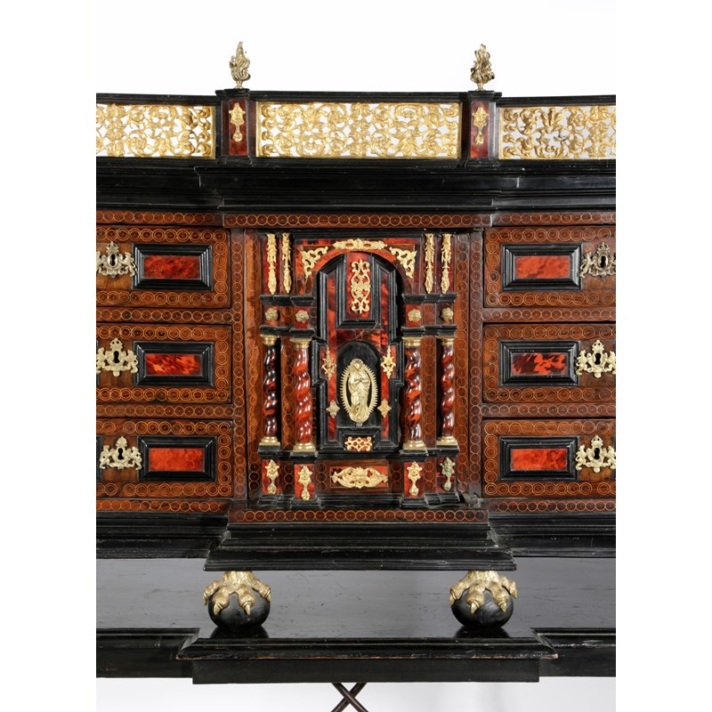 with gilt bronze mounts and ebonised mouldings, the galleried top with flaming urn finials above six drawers flanking an architectural niche door decorated with Solomonic columns and with a plaque of the Virgin Mary, enclosing four drawers on claw and ball feet, with iron side carrying handles, on a later ebonised stand with spiral twist supports and a wrought iron stretcher